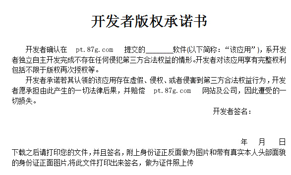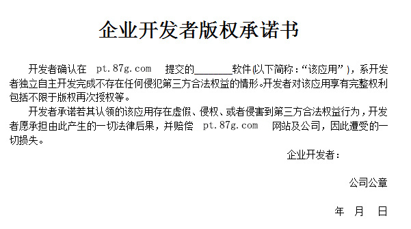2、您软件的著作权或者87G版权承诺书(版权承诺书要求:企业注册请用企业版权承诺书,个人注册请用个人版权承诺书)