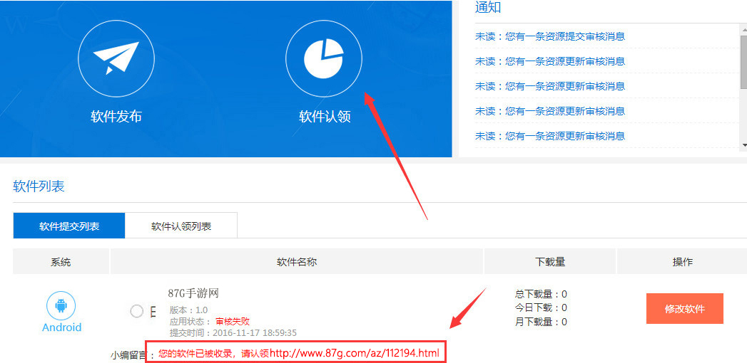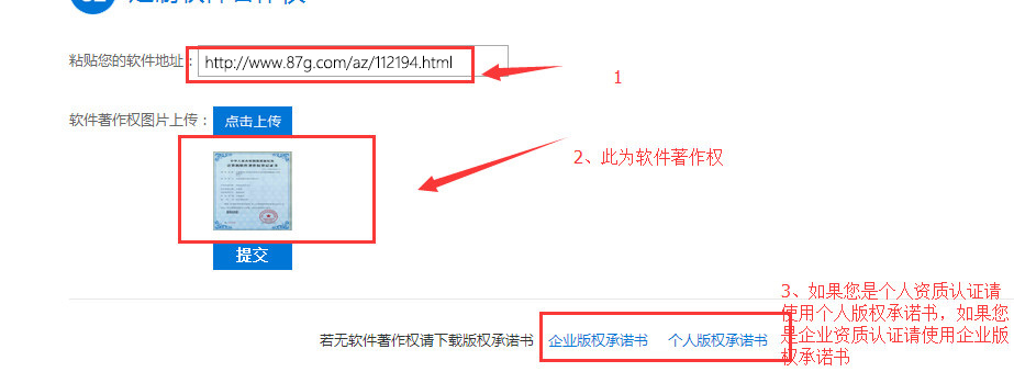 3、提交您的软件在87G下载站的链接和软件著作权(或者版权承诺书)点击“提交”按钮(图7)