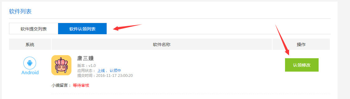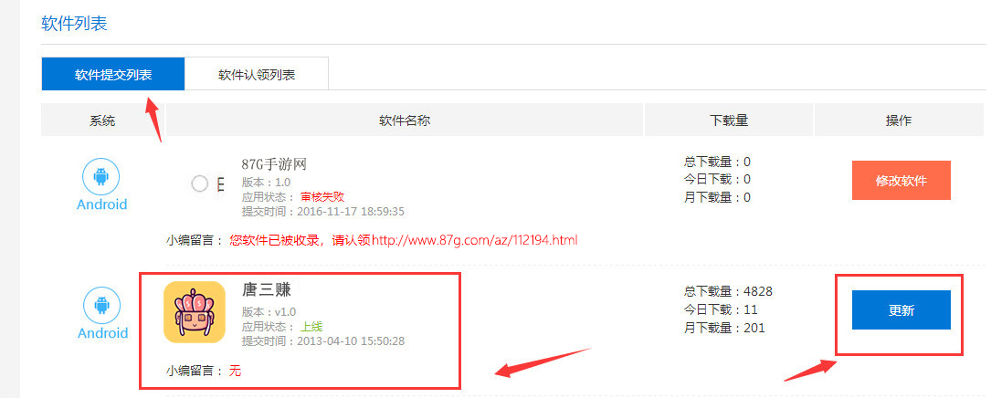6、在软件提交列表中就可以看到认领成功的记录,并且可以对该软件进行更新了(图10)。