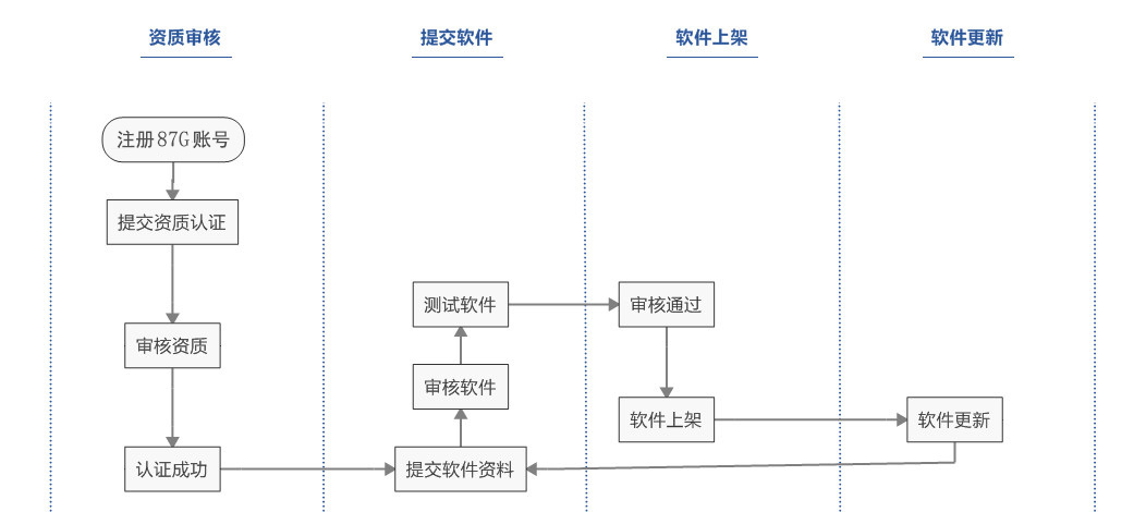 87G开放平台是一个提供免费发布软件的提交平台。平台操作是发布软件最基本的操作,软件发布流程为:资质审核===》提交软件===》软件上架====》软件更新。